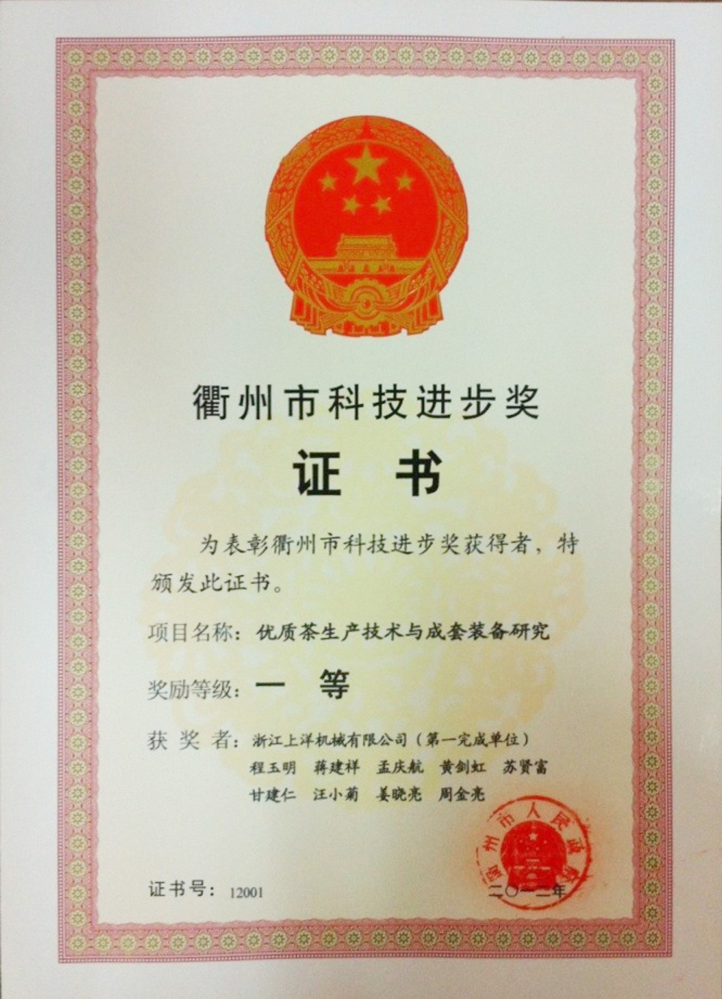 2012年衢州市科技進(jìn)步一等獎(jiǎng)