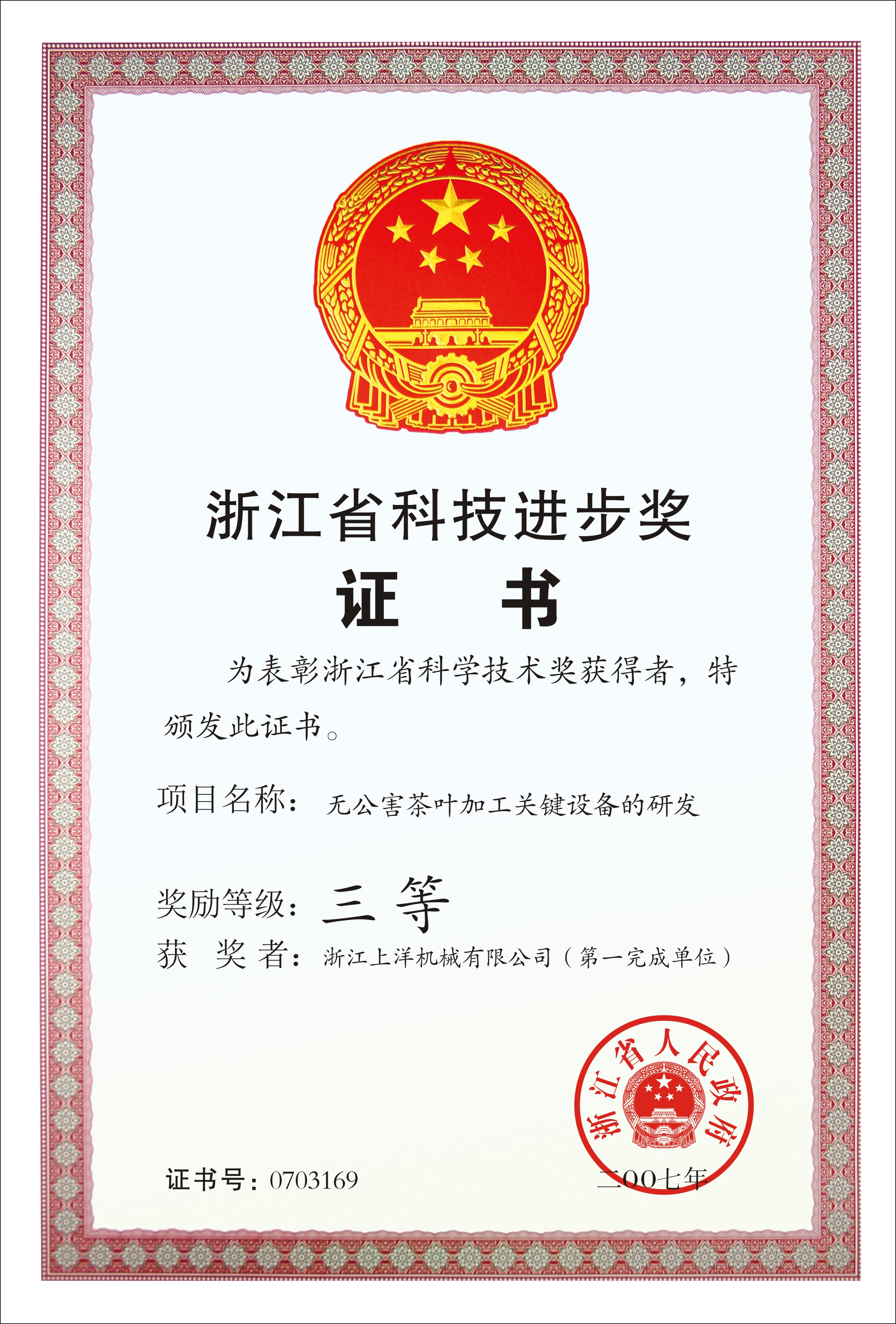 2007年浙江省科技進(jìn)步三等獎(jiǎng)