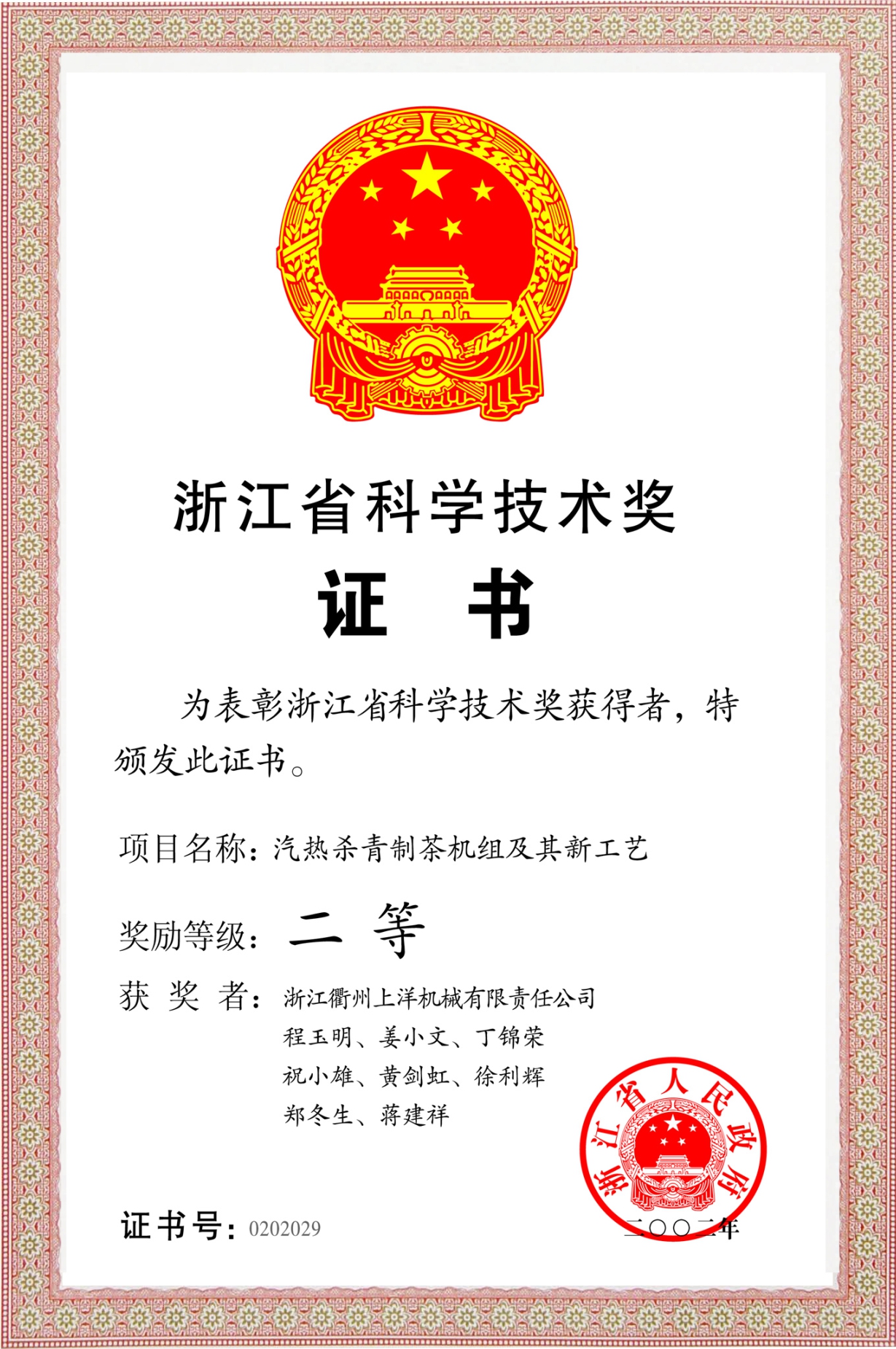 2002年浙江省科學(xué)技術(shù)獎(jiǎng)二等獎(jiǎng)