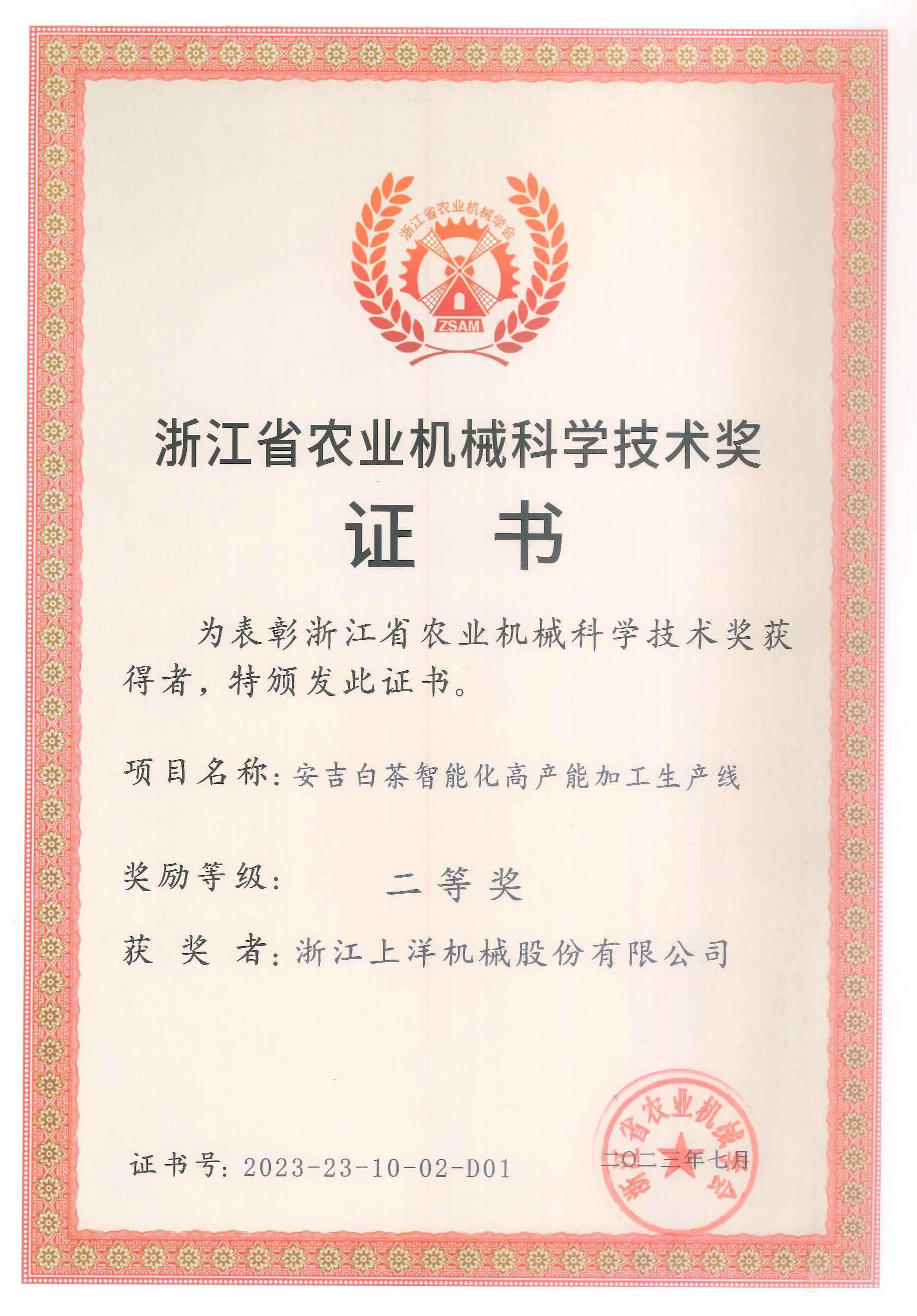 2023年浙江省農(nóng)業(yè)機(jī)械科學(xué)技術(shù)獎(jiǎng)二等獎(jiǎng)