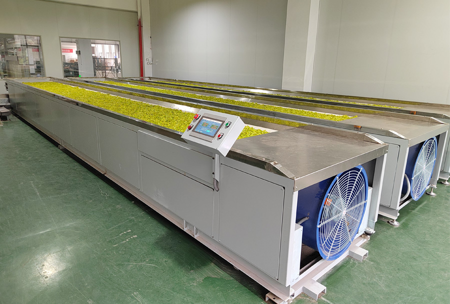 作業(yè)原理:單層式結構,機組采用的集中控制系統(tǒng)可精準控制鼓風時間、風量、溫度、攤葉厚度/重量等主要參數(shù),實現(xiàn)攤青(萎凋)的均勻充分。 利用光電定位系統(tǒng),能有效檢測茶葉流量,可自動控制茶葉進入下一步工藝流程。